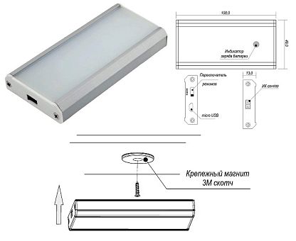 Светильник аккум. (LED) CENTALIUS, с датч. движ, 0,8Вт, 3000K, 50Лм, 1020мА/ч, серебр., магнит