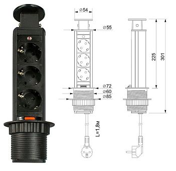 Блок розеток выдвижной круг. d60мм, 16А, 3 поста, черн., провод 1,8м с вилкой