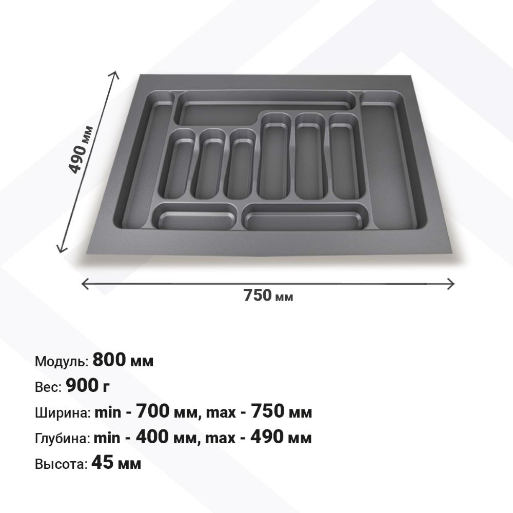 Лотки для столовых приборов EVA позволяют рационально организовать внутреннее пространство выдвижных ящиков. Цвета: серый и белый глянец. Для ящиков 800 мм.
