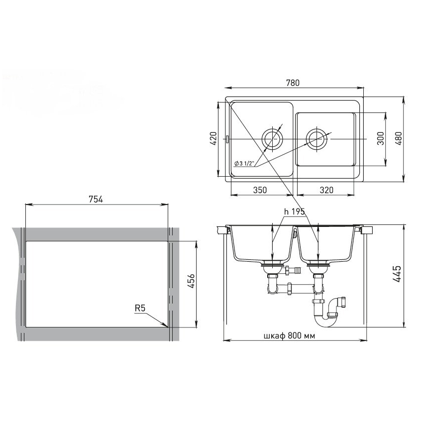 Общий размер мойки