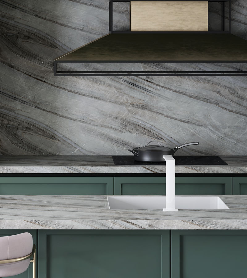 Путешествуя, мы открываем для себя красоту нетронутой природы. Сохранить образ древних таёжных скал на своей кухне позволит декор Мрамор Карелия.